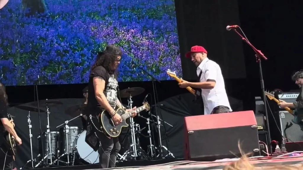Gracias a uno de los afortunados asistentes al festival es que podemos ver a estos verdaderos héroes de la guitarra tocando juntos por primera vez. El tema que interpretaron fue “Interstate 80”, una canción que pertenece al EP de 2020 de Morello llamado Comandante.